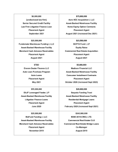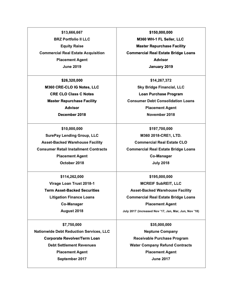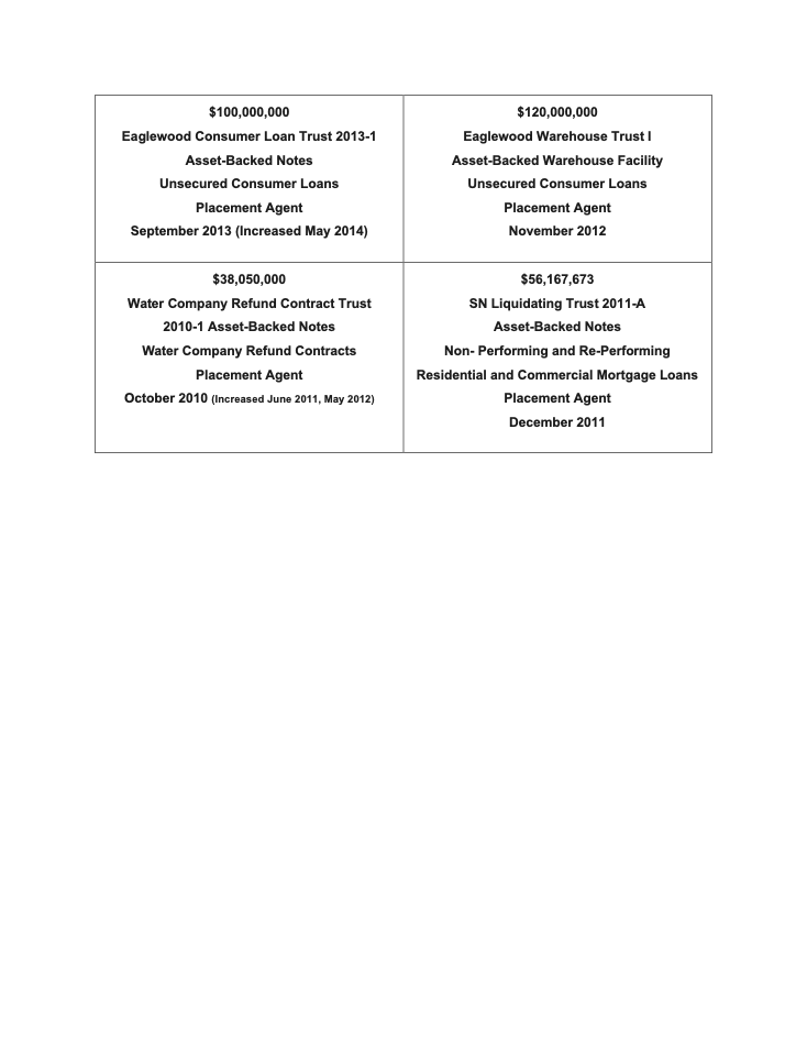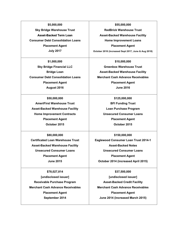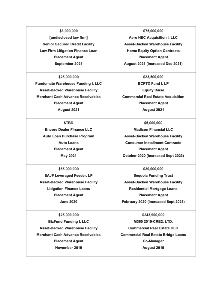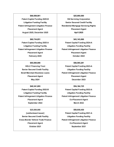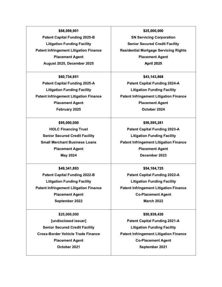 We have successfully completed approximately $2.8 billion across the structured finance space, including patent litigation financings, asset-backed warehouse credit facilities, receivable purchase programs, and asset-backed securitizations for specialty finance companies and asset managers, including: